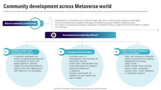 This slide provides information regarding role of community build across Metaverse world. It highlights working of Metaverse community in terms of grabbing suitable crowd, leveraging sense of belonging and enabling memorable experiences. Are you in need of a template that can accommodate all of your creative concepts This one is crafted professionally and can be altered to fit any style. Use it with Google Slides or PowerPoint. Include striking photographs, symbols, depictions, and other visuals. Fill, move around, or remove text boxes as desired. Test out color palettes and font mixtures. Edit and save your work, or work with colleagues. Download Community Development Across Metaverse World Continuum Of Technology Revamping Business AI SS V and observe how to make your presentation outstanding. Give an impeccable presentation to your group and make your presentation unforgettable. This slide provides information regarding role of community build across Metaverse world. It highlights working of Metaverse community in terms of grabbing suitable crowd, leveraging sense of belonging and enabling memorable experiences.