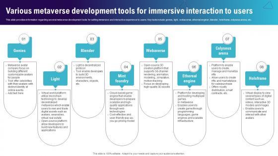 This slide provides information regarding several Metaverse development tools for setting immersive and interactive experience to users. Key tools include Genies, Light, Webaverse, Ethereal Enginer, Blender, Holoframe, Colyseus Arena, etc. Find highly impressive Various Metaverse Development Tools For Immersive Interaction To Users Summary PDF on Slidegeeks to deliver a meaningful presentation. You can save an ample amount of time using these presentation templates. No need to worry to prepare everything from scratch because Slidegeeks experts have already done a huge research and work for you. You need to download Various Metaverse Development Tools For Immersive Interaction To Users Summary PDF for your upcoming presentation. All the presentation templates are 100 percent editable and you can change the color and personalize the content accordingly. Download now.