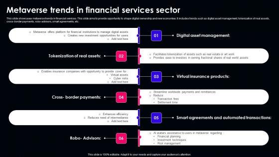 Pitch your topic with ease and precision using this Metaverse Trends In Financial Services Sector Mockup Pdf This layout presents information on Financial Institutions, Creates New Investment, Enables Insurance It is also available for immediate download and adjustment. So, changes can be made in the color, design, graphics or any other component to create a unique layout. This slide showcases metaverse trends in financial services. This slide aims to provide opportunity to shape digital ownership and new economies. It includes trends such as digital asset management, tokenization of real assets, cross border payments, robo advisors, smart agreements, etc.