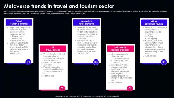 Pitch your topic with ease and precision using this Metaverse Trends In Travel And Tourism Sector Topics Pdf This layout presents information on Virtual Tourism Platforms, Historical Landmarks, Bhutan Mountain It is also available for immediate download and adjustment. So, changes can be made in the color, design, graphics or any other component to create a unique layout. This slide showcases metaverse trends in travel and tourism sector. The purpose of this template is to provide innovative virtual environment where users can interact with others, explore destinations, and participate in various experiences. It includes trends such as AR travel guides, interactive hotel previews, virtual tourism platforms, etc.