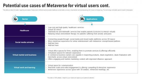 This slide provides information regarding use cases of metaverse in different sectors namely gaming, e-learning, real estate, travel and tourism along with banking and finance. The technology will enable users to exploit virtual space. Whether you have daily or monthly meetings, a brilliant presentation is necessary. Potential Use Cases Of Metaverse For Virtual Users Continuum Of Technology Revamping Business AI SS V can be your best option for delivering a presentation. Represent everything in detail using Potential Use Cases Of Metaverse For Virtual Users Continuum Of Technology Revamping Business AI SS V and make yourself stand out in meetings. The template is versatile and follows a structure that will cater to your requirements. All the templates prepared by Slidegeeks are easy to download and edit. Our research experts have taken care of the corporate themes as well. So, give it a try and see the results. This slide provides information regarding use cases of metaverse in different sectors namely gaming, e-learning, real estate, travel and tourism along with banking and finance. The technology will enable users to exploit virtual space.