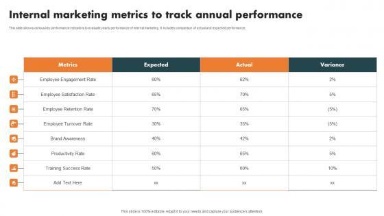 This slide shows various key performance indicators to evaluate yearly performance of internal marketing. It includes comparison of actual and expected performance. Crafting an eye catching presentation has never been more straightforward. Let your presentation shine with this tasteful yet straightforward Internal Marketing Metrics Track Internal Branding Strategy For Enhanced Advocacy Icons Pdf template. It offers a minimalistic and classy look that is great for making a statement. The colors have been employed intelligently to add a bit of playfulness while still remaining professional. Construct the ideal Internal Marketing Metrics Track Internal Branding Strategy For Enhanced Advocacy Icons Pdf that effortlessly grabs the attention of your audience Begin now and be certain to wow your customers This slide shows various key performance indicators to evaluate yearly performance of internal marketing. It includes comparison of actual and expected performance.