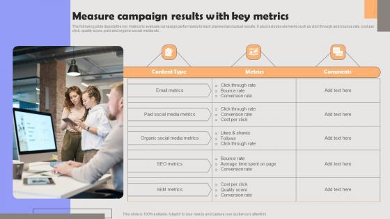The following slide depicts the key metrics to evaluate campaign performance to track planned and actual results. It also includes elements such as click through and bounce rate, cost per click, quality score, paid and organic social media etc. Explore a selection of the finest Measure Campaign Results With Key Metrics Ppt Pictures Examples PDF here. With a plethora of professionally designed and pre made slide templates, you can quickly and easily find the right one for your upcoming presentation. You can use our Measure Campaign Results With Key Metrics Ppt Pictures Examples PDF to effectively convey your message to a wider audience. Slidegeeks has done a lot of research before preparing these presentation templates. The content can be personalized and the slides are highly editable. Grab templates today from Slidegeeks.
