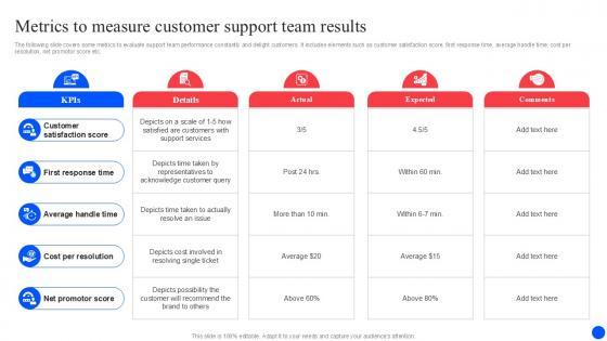 The following slide covers some metrics to evaluate support team performance constantly and delight customers. It includes elements such as customer satisfaction score, first response time, average handle time, cost per resolution, net promotor score etc. This Metrics To Measure Improving Customer Retention PPT Example is perfect for any presentation, be it in front of clients or colleagues. It is a versatile and stylish solution for organizing your meetings. The Metrics To Measure Improving Customer Retention PPT Example features a modern design for your presentation meetings. The adjustable and customizable slides provide unlimited possibilities for acing up your presentation. Slidegeeks has done all the homework before launching the product for you. So, do not wait, grab the presentation templates today The following slide covers some metrics to evaluate support team performance constantly and delight customers. It includes elements such as customer satisfaction score, first response time, average handle time, cost per resolution, net promotor score etc.