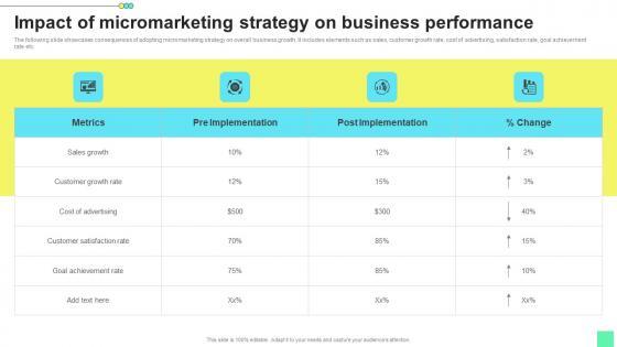 The following slide showcases consequences of adopting micromarketing strategy on overall business growth. It includes elements such as sales, customer growth rate, cost of advertising, satisfaction rate, goal achievement rate etc. Formulating a presentation can take up a lot of effort and time, so the content and message should always be the primary focus. The visuals of the PowerPoint can enhance the presenters message, so our Impact Of Micromarketing Strategy Introduction To Niche Marketing Audience Segmentation Formats Pdf was created to help save time. Instead of worrying about the design, the presenter can concentrate on the message while our designers work on creating the ideal templates for whatever situation is needed. Slidegeeks has experts for everything from amazing designs to valuable content, we have put everything into Impact Of Micromarketing Strategy Introduction To Niche Marketing Audience Segmentation Formats Pdf The following slide showcases consequences of adopting micromarketing strategy on overall business growth. It includes elements such as sales, customer growth rate, cost of advertising, satisfaction rate, goal achievement rate etc.