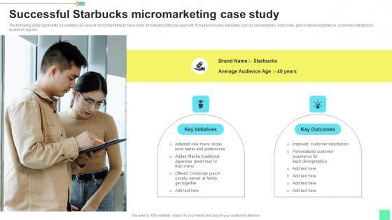The following slide represents successful use case of micromarketing to save costs and target particular segment. It mainly includes elements such as key initiatives, outcomes, personalized experience, customer satisfaction, audience age etc. Are you in need of a template that can accommodate all of your creative concepts This one is crafted professionally and can be altered to fit any style. Use it with Google Slides or PowerPoint. Include striking photographs, symbols, depictions, and other visuals. Fill, move around, or remove text boxes as desired. Test out color palettes and font mixtures. Edit and save your work, or work with colleagues. Download Successful Starbucks Micromarketing Introduction To Niche Marketing Audience Segmentation Introduction Pdf and observe how to make your presentation outstanding. Give an impeccable presentation to your group and make your presentation unforgettable. The following slide represents successful use case of micromarketing to save costs and target particular segment. It mainly includes elements such as key initiatives, outcomes, personalized experience, customer satisfaction, audience age etc.