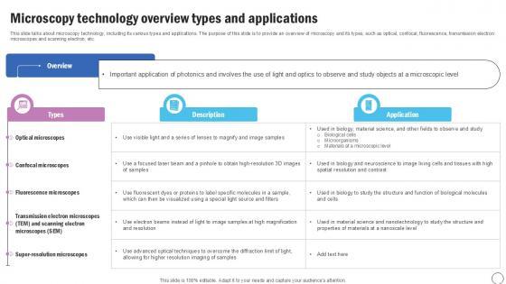 This slide talks about microscopy technology, including its various types and applications. The purpose of this slide is to provide an overview of microscopy and its types, such as optical, confocal, fluorescence, transmission electron microscopes and scanning electron, etc.Presenting this PowerPoint presentation, titled Microscopy Technology Overview Silicon Photonics SiPh It Ppt Template, with topics curated by our researchers after extensive research. This editable presentation is available for immediate download and provides attractive features when used. Download now and captivate your audience. Presenting this Microscopy Technology Overview Silicon Photonics SiPh It Ppt Template. Our researchers have carefully researched and created these slides with all aspects taken into consideration. This is a completely customizable Microscopy Technology Overview Silicon Photonics SiPh It Ppt Template that is available for immediate downloading. Download now and make an impact on your audience. Highlight the attractive features available with our PPTs. This slide talks about microscopy technology, including its various types and applications. The purpose of this slide is to provide an overview of microscopy and its types, such as optical, confocal, fluorescence, transmission electron microscopes and scanning electron, etc.
