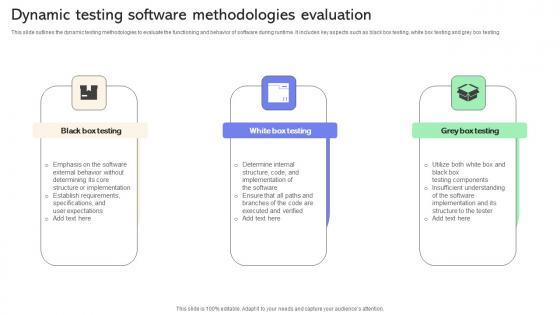 This slide outlines the dynamic testing methodologies to evaluate the functioning and behavior of software during runtime. It includes key aspects such as black box testing, white box testing and grey box testing. Pitch your topic with ease and precision using this Dynamic Testing Software Methodologies Evaluation Ppt Layouts Microsoft Pdf. This layout presents information on Black Box Testing, White Box Testing, Grey Box Testing. It is also available for immediate download and adjustment. So, changes can be made in the color, design, graphics or any other component to create a unique layout. This slide outlines the dynamic testing methodologies to evaluate the functioning and behavior of software during runtime. It includes key aspects such as black box testing,white box testing and grey box testing.