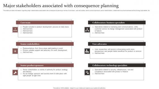 This slide provides information regarding major stakeholders associated with consequence planning in terms of core team, user advocates, senior product sponsors, senior stakeholders, collaborators such as business and technology specialists, etc. Slidegeeks has constructed Major Stakeholders Associated Responsible Technology Governance Manual Microsoft Pdf after conducting extensive research and examination. These presentation templates are constantly being generated and modified based on user preferences and critiques from editors. Here, you will find the most attractive templates for a range of purposes while taking into account ratings and remarks from users regarding the content. This is an excellent jumping off point to explore our content and will give new users an insight into our top notch PowerPoint Templates. This slide provides information regarding major stakeholders associated with consequence planning in terms of core team, user advocates, senior product sponsors, senior stakeholders, collaborators such as business and technology specialists, etc.