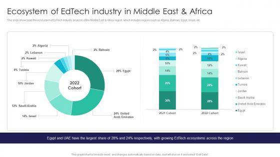 This slide showcases the ecosystem of EdTech industry analysis of the Middle East and Africa region, which includes regions such as Algeria, Bahrain, Egypt, Israel, etc. Get a simple yet stunning designed Global Digital Education Ecosystem Of Edtech Industry In Middle East And Africa IR SS V. It is the best one to establish the tone in your meetings. It is an excellent way to make your presentations highly effective. So, download this PPT today from Slidegeeks and see the positive impacts. Our easy-to-edit Global Digital Education Ecosystem Of Edtech Industry In Middle East And Africa IR SS V can be your go-to option for all upcoming conferences and meetings. So, what are you waiting for Grab this template today. This slide showcases the ecosystem of EdTech industry analysis of the Middle East and Africa region, which includes regions such as Algeria, Bahrain, Egypt, Israel, etc.