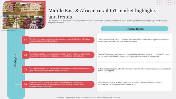 The following slide illustrates the major highlights for retail IoT market in the Middle East and African region and the growth trends assisting the growth of internet of things in retail sector. Here you can discover an assortment of the finest PowerPoint and Google Slides templates. With these templates, you can create presentations for a variety of purposes while simultaneously providing your audience with an eye-catching visual experience. Download Middle East And African Retail Iot Market Highlights And Trends Demonstration PDF to deliver an impeccable presentation. These templates will make your job of preparing presentations much quicker, yet still, maintain a high level of quality. Slidegeeks has experienced researchers who prepare these templates and write high-quality content for you. Later on, you can personalize the content by editing the Middle East And African Retail Iot Market Highlights And Trends Demonstration PDF.