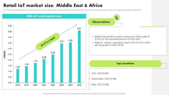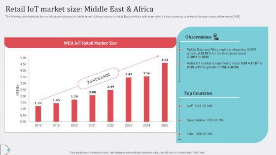 The following slide highlights the market value and forecast of retail internet of things industry in Middle East and Africa with observations. It also shows top countries in the region along with revenue CAGR. Slidegeeks is here to make your presentations a breeze with Retail IoT Market Size Middle East How Industrial IoT Is Changing Worldwide Designs Pdf With our easy to use and customizable templates, you can focus on delivering your ideas rather than worrying about formatting. With a variety of designs to choose from, you are sure to find one that suits your needs. And with animations and unique photos, illustrations, and fonts, you can make your presentation pop. So whether you are giving a sales pitch or presenting to the board, make sure to check out Slidegeeks first The following slide highlights the market value and forecast of retail internet of things industry in Middle East and Africa with observations. It also shows top countries in the region along with revenue CAGR.
