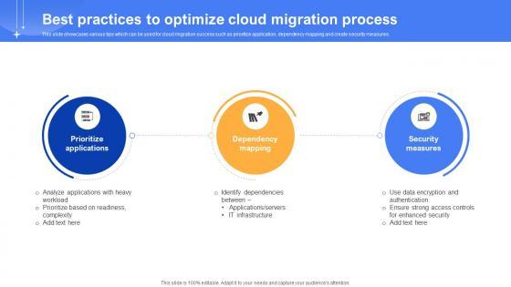 This slide showcases various tips which can be used for cloud migration success such as prioritize application, dependency mapping and create security measures. There are so many reasons you need a Best Practices To Optimize Cloud Migration Process Data Migration From On Premises. The first reason is you can not spend time making everything from scratch, Thus, Slidegeeks has made presentation templates for you too. You can easily download these templates from our website easily. This slide showcases various tips which can be used for cloud migration success such as prioritize application, dependency mapping and create security measures.