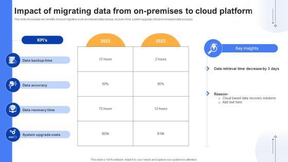 This slide showcases key benefits of cloud migration such as reduced data backup, recovery time, system upgrade cost and increased data accuracy. Explore a selection of the finest Effective Data Migration Impact Of Migrating Data From On Premises To Cloud here. With a plethora of professionally designed and pre-made slide templates, you can quickly and easily find the right one for your upcoming presentation. You can use our Effective Data Migration Impact Of Migrating Data From On Premises To Cloud to effectively convey your message to a wider audience. Slidegeeks has done a lot of research before preparing these presentation templates. The content can be personalized and the slides are highly editable. Grab templates today from Slidegeeks. This slide showcases key benefits of cloud migration such as reduced data backup, recovery time, system upgrade cost and increased data accuracy.