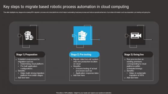 This slide highlights key stages showcasing RPA migration process onto cloud platforms which helps in automating business process and reduce operational barriers. It provides information such as preparation, pre testing and going live. Pitch your topic with ease and precision using this Key Steps To Migrate Based Robotic Process Automation In Cloud Computing Icons Pdf. This layout presents information on Preparation, Pre Testing, Going Live. It is also available for immediate download and adjustment. So, changes can be made in the color, design, graphics or any other component to create a unique layout. This slide highlights key stages showcasing RPA migration process onto cloud platforms which helps in automating business process and reduce operational barriers. It provides information such as preparation, pre testing and going live.