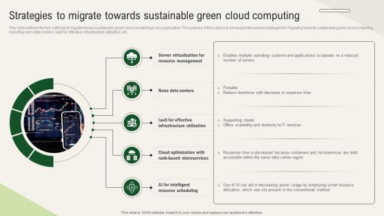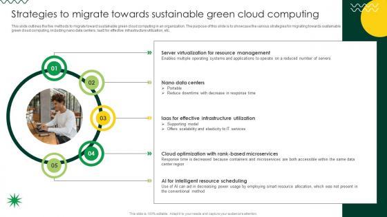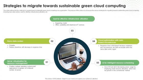 This slide outlines the five methods to migrate toward sustainable green cloud computing in an organization. The purpose of this slide is to showcase the various strategies for migrating towards sustainable green cloud computing, including nano data centers, IaaS for effective infrastructure utilization, etc. From laying roadmaps to briefing everything in detail, our templates are perfect for you. You can set the stage with your presentation slides. All you have to do is download these easy-to-edit and customizable templates. Green Computing Strategies To Migrate Towards Sustainable Green Cloud Computing will help you deliver an outstanding performance that everyone would remember and praise you for. Do download this presentation today. This slide outlines the five methods to migrate toward sustainable green cloud computing in an organization. The purpose of this slide is to showcase the various strategies for migrating towards sustainable green cloud computing, including nano data centers, IaaS for effective infrastructure utilization, etc.