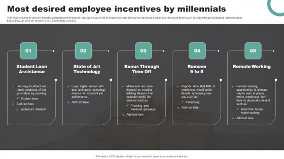 This slide showcase workers benefits wanted by millennials to improve the work life of employees and provide best perks to employees. It include perks such as student loan assistance, art technology, bonus through time off, remove 9 to 5 and remote working. Showcasing this set of slides titled Most Desired Employee Incentives By Millennials Template Pdf The topics addressed in these templates are Student Loan Assistance, Art Technology, Remote Working All the content presented in this PPT design is completely editable. Download it and make adjustments in color, background, font etc. as per your unique business setting. This slide showcase workers benefits wanted by millennials to improve the work life of employees and provide best perks to employees. It include perks such as student loan assistance, art technology, bonus through time off, remove 9 to 5 and remote working.