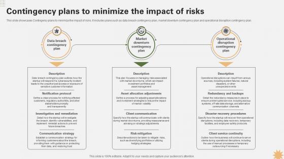This slide showcases Contingency plans to minimize the impact of risks. It includes plans such as data breach contingency plan, market downturn contingency plan and operational disruption contingency plan. Want to ace your presentation in front of a live audience Our Contingency Plans To Minimize The Impact Of Risks Penetrating Markets With Financial Strategy SS V can help you do that by engaging all the users towards you. Slidegeeks experts have put their efforts and expertise into creating these impeccable powerpoint presentations so that you can communicate your ideas clearly. Moreover, all the templates are customizable, and easy to edit and downloadable. Use these for both personal and commercial use. This slide showcases Contingency plans to minimize the impact of risks. It includes plans such as data breach contingency plan, market downturn contingency plan and operational disruption contingency plan.