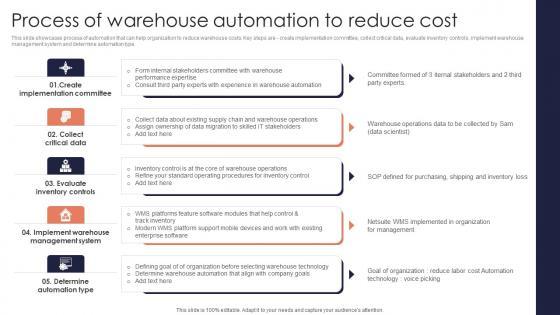This slide showcases process of automation that can help organization to reduce warehouse costs. Key steps are create implementation committee, collect critical data, evaluate inventory controls, implement warehouse management system and determine automation type. Coming up with a presentation necessitates that the majority of the effort goes into the content and the message you intend to convey. The visuals of a PowerPoint presentation can only be effective if it supplements and supports the story that is being told. Keeping this in mind our experts created Process Warehouse Automation Minimizing Inventory Wastage Through Warehouse Introduction Pdf to reduce the time that goes into designing the presentation. This way, you can concentrate on the message while our designers take care of providing you with the right template for the situation. This slide showcases process of automation that can help organization to reduce warehouse costs. Key steps are create implementation committee, collect critical data, evaluate inventory controls, implement warehouse management system and determine automation type.