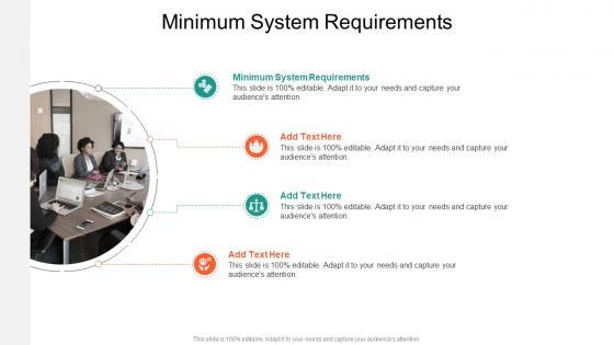 Introducing our well-designed Minimum System Requirements In Powerpoint And Google Slides Cpb. This PowerPoint design presents information on topics like Minimum System Requirements. As it is predesigned it helps boost your confidence level. It also makes you a better presenter because of its high-quality content and graphics. This PPT layout can be downloaded and used in different formats like PDF, PNG, and JPG. Not only this, it is available in both Standard Screen and Widescreen aspect ratios for your convenience. Therefore, click on the download button now to persuade and impress your audience. Our Minimum System Requirements In Powerpoint And Google Slides Cpb are topically designed to provide an attractive backdrop to any subject. Use them to look like a presentation pro.