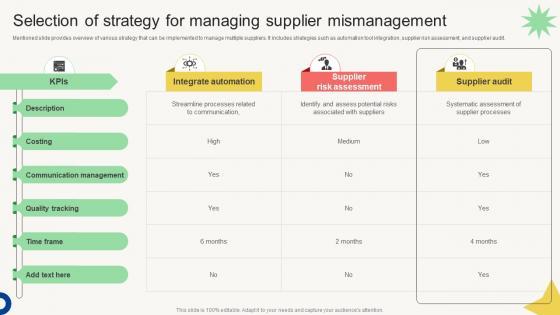 Mentioned slide provides overview of various strategy that can be implemented to manage multiple suppliers. It includes strategies such as automation tool integration, supplier risk assessment, and supplier audit. The Vendor Management Audit Selection Of Strategy For Managing Supplier Mismanagement is a compilation of the most recent design trends as a series of slides. It is suitable for any subject or industry presentation, containing attractive visuals and photo spots for businesses to clearly express their messages. This template contains a variety of slides for the user to input data, such as structures to contrast two elements, bullet points, and slides for written information. Slidegeeks is prepared to create an impression. Mentioned slide provides overview of various strategy that can be implemented to manage multiple suppliers. It includes strategies such as automation tool integration, supplier risk assessment, and supplier audit.