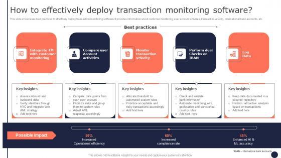 This slide showcases best practices to effectively deploy transaction monitoring software. It provides information about customer monitoring, user account activities, transaction velocity, international bank accounts, etc. Crafting an eye-catching presentation has never been more straightforward. Let your presentation shine with this tasteful yet straightforward How To Effectively Deploy Transaction Monitoring Mitigating Corporate Scams And Robberies Template Pdf template. It offers a minimalistic and classy look that is great for making a statement. The colors have been employed intelligently to add a bit of playfulness while still remaining professional. Construct the ideal How To Effectively Deploy Transaction Monitoring Mitigating Corporate Scams And Robberies Template Pdf that effortlessly grabs the attention of your audience. Begin now and be certain to wow your customers. This slide showcases best practices to effectively deploy transaction monitoring software. It provides information about customer monitoring, user account activities, transaction velocity, international bank accounts, etc.