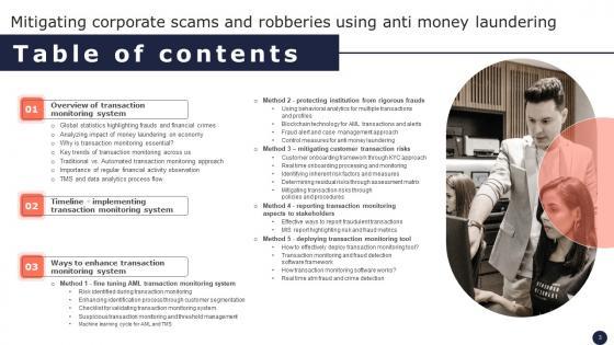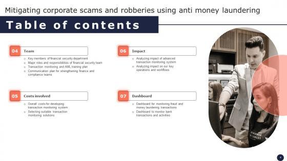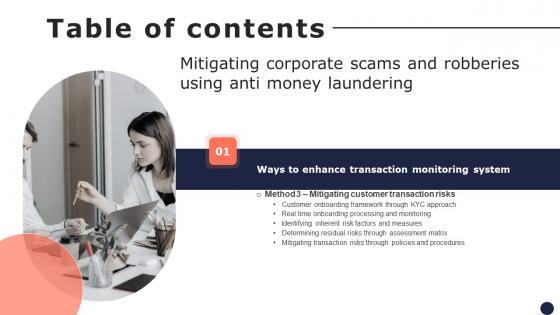 Create an editable Table Of Contents Mitigating Corporate Scams And Robberies Using Anti Money Laundering Mockup Pdf that communicates your idea and engages your audience. Whether you are presenting a business or an educational presentation, pre-designed presentation templates help save time. Table Of Contents Mitigating Corporate Scams And Robberies Using Anti Money Laundering Mockup Pdf is highly customizable and very easy to edit, covering many different styles from creative to business presentations. Slidegeeks has creative team members who have crafted amazing templates. So, go and get them without any delay. Our Table Of Contents Mitigating Corporate Scams And Robberies Using Anti Money Laundering Mockup Pdf are topically designed to provide an attractive backdrop to any subject. Use them to look like a presentation pro.