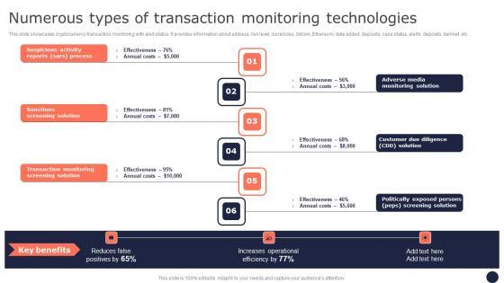 This slide showcases cryptocurrency transaction monitoring with alert status. It provides information about address, risk level, currencies, bitcoin, Ethereum, date added, deposits, case status, alerts, deposits, darknet, etc. Slidegeeks has constructed Numerous Types Of Transaction Monitoring Mitigating Corporate Scams And Robberies Diagrams Pdf after conducting extensive research and examination. These presentation templates are constantly being generated and modified based on user preferences and critiques from editors. Here, you will find the most attractive templates for a range of purposes while taking into account ratings and remarks from users regarding the content. This is an excellent jumping-off point to explore our content and will give new users an insight into our top-notch PowerPoint Templates. This slide showcases cryptocurrency transaction monitoring with alert status. It provides information about address, risk level, currencies, bitcoin, Ethereum, date added, deposits, case status, alerts, deposits, darknet, etc.
