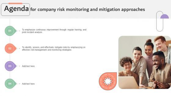 Find a pre-designed and impeccable Agenda For Company Risk Monitoring And Mitigation Approaches DTE SS V. The templates can ace your presentation without additional effort. You can download these easy-to-edit presentation templates to make your presentation stand out from others. So, what are you waiting for Download the template from Slidegeeks today and give a unique touch to your presentation. Our Agenda For Company Risk Monitoring And Mitigation Approaches DTE SS V are topically designed to provide an attractive backdrop to any subject. Use them to look like a presentation pro.