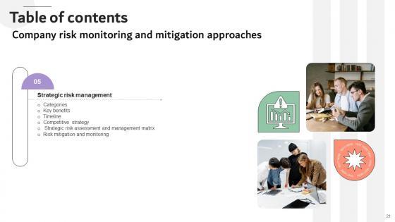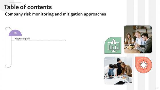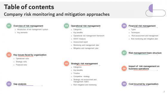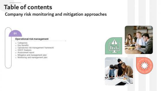 The Table Of Contents Company Risk Monitoring And Mitigation Approaches DTE SS V is a compilation of the most recent design trends as a series of slides. It is suitable for any subject or industry presentation, containing attractive visuals and photo spots for businesses to clearly express their messages. This template contains a variety of slides for the user to input data, such as structures to contrast two elements, bullet points, and slides for written information. Slidegeeks is prepared to create an impression. Our Table Of Contents Company Risk Monitoring And Mitigation Approaches DTE SS V are topically designed to provide an attractive backdrop to any subject. Use them to look like a presentation pro.
