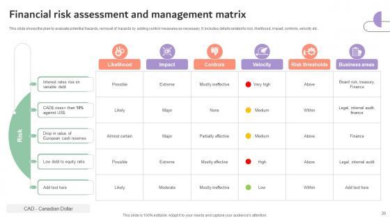 This slide covers the model to manage the risks faced by the banks due to use of financial services. It includes details related to regulator, internal and external audit, governing body, senior management etc. If your project calls for a presentation, then Slidegeeks is your go to partner because we have professionally designed, easy to edit templates that are perfect for any presentation. After downloading, you can easily edit Company Risk Assessment Plan Financial Risk Management And Mitigation Approaches Pictures PDF and make the changes accordingly. You can rearrange slides or fill them with different images. Check out all the handy templates