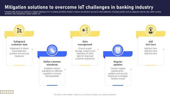 Following slide showcases solutions to mitigate challenges of IoT in banking and fintech industry to improve and enhance services for client satisfaction. It includes pointers such as safeguard customer data, define common standards, data management, regular updates, etc. Welcome to our selection of the Mitigation Solutions To Overcome Banking Future With IoT Ppt Slide IoT SS V. These are designed to help you showcase your creativity and bring your sphere to life. Planning and Innovation are essential for any business that is just starting out. This collection contains the designs that you need for your everyday presentations. All of our PowerPoints are 100Percent editable, so you can customize them to suit your needs. This multi-purpose template can be used in various situations. Grab these presentation templates today. Following slide showcases solutions to mitigate challenges of IoT in banking and fintech industry to improve and enhance services for client satisfaction. It includes pointers such as safeguard customer data, define common standards, data management, regular updates, etc.