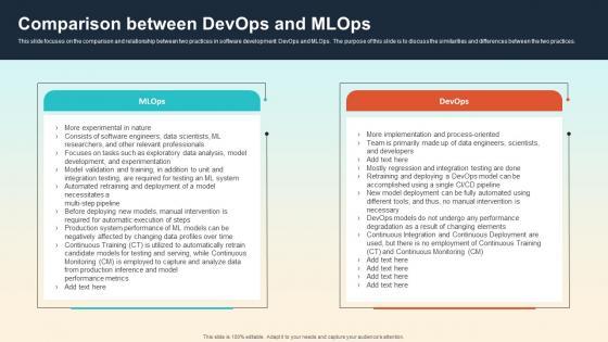 This slide focuses on the comparison and relationship between two practices in software development DevOps and MLOps. The purpose of this slide is to discuss the similarities and differences between the two practices. Crafting an eye-catching presentation has never been more straightforward. Let your presentation shine with this tasteful yet straightforward Comparison Between Devops And MLOPs Introduction To MLOPs IT template. It offers a minimalistic and classy look that is great for making a statement. The colors have been employed intelligently to add a bit of playfulness while still remaining professional. Construct the ideal Comparison Between Devops And MLOPs Introduction To MLOPs IT that effortlessly grabs the attention of your audience Begin now and be certain to wow your customers This slide focuses on the comparison and relationship between two practices in software development DevOps and MLOps. The purpose of this slide is to discuss the similarities and differences between the two practices.