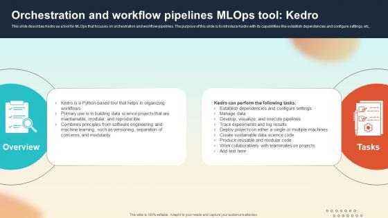 This slide describes Kedro as a tool for MLOps that focuses on orchestration and workflow pipelines. The purpose of this slide is to introduce Kedro with its capabilities like establish dependencies and configure settings, etc. Slidegeeks is one of the best resources for PowerPoint templates. You can download easily and regulate Orchestration And Workflow Pipelines MLOPs Tool Kedro Introduction To MLOPs IT for your personal presentations from our wonderful collection. A few clicks is all it takes to discover and get the most relevant and appropriate templates. Use our Templates to add a unique zing and appeal to your presentation and meetings. All the slides are easy to edit and you can use them even for advertisement purposes. This slide describes Kedro as a tool for MLOps that focuses on orchestration and workflow pipelines. The purpose of this slide is to introduce Kedro with its capabilities like establish dependencies and configure settings, etc, .