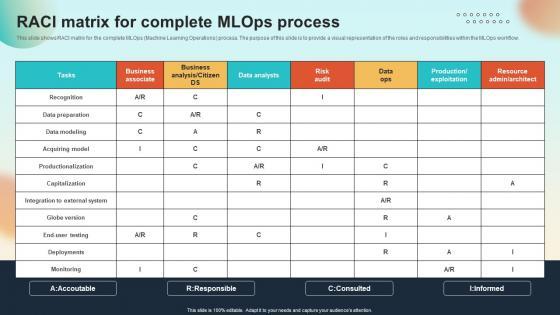 This slide shows RACI matrix for the complete MLOps Machine Learning Operations process. The purpose of this slide is to provide a visual representation of the roles and responsibilities within the MLOps workflow. Find highly impressive RACI Matrix For Complete MLOPs Process Introduction To MLOPs IT on Slidegeeks to deliver a meaningful presentation. You can save an ample amount of time using these presentation templates. No need to worry to prepare everything from scratch because Slidegeeks experts have already done a huge research and work for you. You need to download RACI Matrix For Complete MLOPs Process Introduction To MLOPs IT for your upcoming presentation. All the presentation templates are 100 percent editable and you can change the color and personalize the content accordingly. Download now This slide shows RACI matrix for the complete MLOps Machine Learning Operations process. The purpose of this slide is to provide a visual representation of the roles and responsibilities within the MLOps workflow.