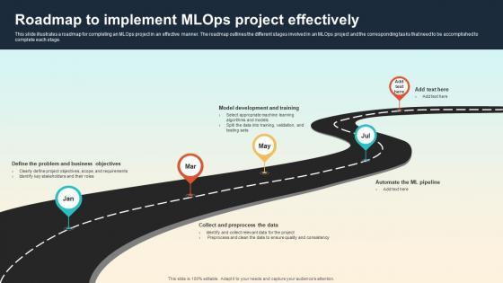 This slide illustrates a roadmap for completing an MLOps project in an effective manner. The roadmap outlines the different stages involved in an MLOps project and the corresponding tasks that need to be accomplished to complete each stage. If your project calls for a presentation, then Slidegeeks is your go-to partner because we have professionally designed, easy-to-edit templates that are perfect for any presentation. After downloading, you can easily edit Roadmap To Implement MLOPs Project Effectively Introduction To MLOPs IT and make the changes accordingly. You can rearrange slides or fill them with different images. Check out all the handy templates This slide illustrates a roadmap for completing an MLOps project in an effective manner. The roadmap outlines the different stages involved in an MLOps project and the corresponding tasks that need to be accomplished to complete each stage.