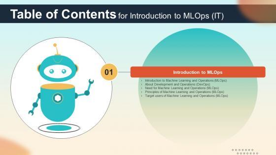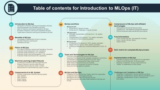 Make sure to capture your audiences attention in your business displays with our gratis customizable Table Of Contents Introduction To MLOPs IT Ppt Information. These are great for business strategies, office conferences, capital raising or task suggestions. If you desire to acquire more customers for your tech business and ensure they stay satisfied, create your own sales presentation with these plain slides. Our Table Of Contents Introduction To MLOPs IT Ppt Information are topically designed to provide an attractive backdrop to any subject. Use them to look like a presentation pro.