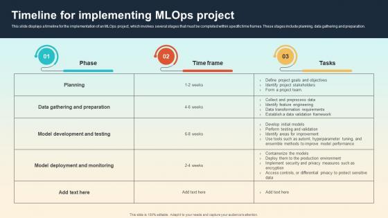 This slide displays a timeline for the implementation of an MLOps project, which involves several stages that must be completed within specific time frames. These stages include planning, data gathering and preparation. Coming up with a presentation necessitates that the majority of the effort goes into the content and the message you intend to convey. The visuals of a PowerPoint presentation can only be effective if it supplements and supports the story that is being told. Keeping this in mind our experts created Timeline For Implementing MLOPs Project Introduction To MLOPs IT to reduce the time that goes into designing the presentation. This way, you can concentrate on the message while our designers take care of providing you with the right template for the situation. This slide displays a timeline for the implementation of an MLOps project, which involves several stages that must be completed within specific time frames. These stages include planning, data gathering and preparation.