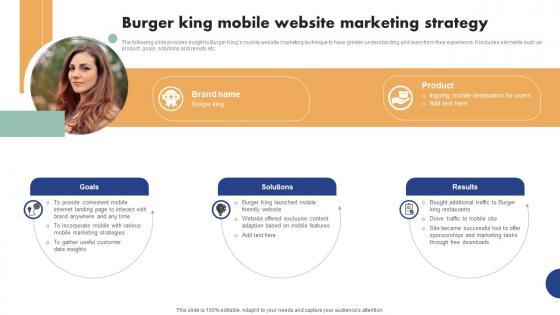 The following slide provides insight to Burger Kings mobile website marketing technique to have greater understanding and learn from their experience. It includes elements such as product, goals, solutions and results etc. Want to ace your presentation in front of a live audience Our Mobile Ad Campaign Launch Strategy Burger King Mobile Website Marketing Strategy Sample Pdf can help you do that by engaging all the users towards you. Slidegeeks experts have put their efforts and expertise into creating these impeccable powerpoint presentations so that you can communicate your ideas clearly. Moreover, all the templates are customizable, and easy-to-edit and downloadable. Use these for both personal and commercial use. The following slide provides insight to Burger Kings mobile website marketing technique to have greater understanding and learn from their experience. It includes elements such as product, goals, solutions and results etc.