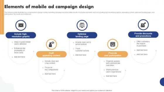The following slide illustrates key components to design mobile marketing campaign and drive better results. It includes elements such as including high resolution graphics, appealing content, optimized landing page, user participation, discounts, promotions etc. From laying roadmaps to briefing everything in detail, our templates are perfect for you. You can set the stage with your presentation slides. All you have to do is download these easy-to-edit and customizable templates. Mobile Ad Campaign Launch Strategy Elements Of Mobile Ad Campaign Design Clipart Pdf will help you deliver an outstanding performance that everyone would remember and praise you for. Do download this presentation today. The following slide illustrates key components to design mobile marketing campaign and drive better results. It includes elements such as including high resolution graphics, appealing content, optimized landing page, user participation, discounts, promotions etc.