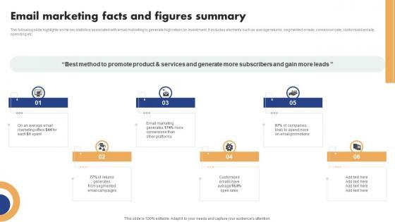The following slide highlights some key statistics associated with email marketing to generate high return on investment. It includes elements such as average returns, segmented emails, conversion rate, customized emails, spending etc. Slidegeeks is here to make your presentations a breeze with Mobile Ad Campaign Launch Strategy Email Marketing Facts And Figures Summary Inspiration Pdf With our easy-to-use and customizable templates, you can focus on delivering your ideas rather than worrying about formatting. With a variety of designs to choose from, you are sure to find one that suits your needs. And with animations and unique photos, illustrations, and fonts, you can make your presentation pop. So whether you are giving a sales pitch or presenting to the board, make sure to check out Slidegeeks first. The following slide highlights some key statistics associated with email marketing to generate high return on investment. It includes elements such as average returns, segmented emails, conversion rate, customized emails, spending etc.