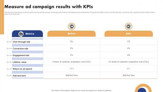 The following slide depicts some key performance indicators to track campaign performance and strategic goals achievement. It includes elements such as click through rate, conversion rate, engagement rate, lifetime value, return on as spend etc. If you are looking for a format to display your unique thoughts, then the professionally designed Mobile Ad Campaign Launch Strategy Measure Ad Campaign Results With KPIs Formats Pdf is the one for you. You can use it as a Google Slides template or a PowerPoint template. Incorporate impressive visuals, symbols, images, and other charts. Modify or reorganize the text boxes as you desire. Experiment with shade schemes and font pairings. Alter, share or cooperate with other people on your work. Download Mobile Ad Campaign Launch Strategy Measure Ad Campaign Results With KPIs Formats Pdf and find out how to give a successful presentation. Present a perfect display to your team and make your presentation unforgettable. The following slide depicts some key performance indicators to track campaign performance and strategic goals achievement. It includes elements such as click through rate, conversion rate, engagement rate, lifetime value, return on as spend etc.
