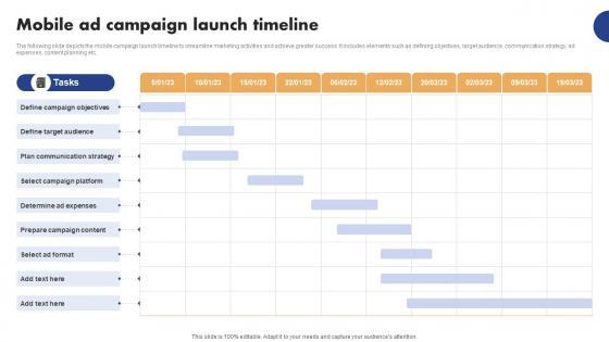 The following slide depicts the mobile campaign launch timeline to streamline marketing activities and achieve greater success. It includes elements such as defining objectives, target audience, communication strategy, ad expenses, content planning etc. Make sure to capture your audiences attention in your business displays with our gratis customizable Mobile Ad Campaign Launch Leveraging Mobile Marketing Strategies Summary Pdf. These are great for business strategies, office conferences, capital raising or task suggestions. If you desire to acquire more customers for your tech business and ensure they stay satisfied, create your own sales presentation with these plain slides. The following slide depicts the mobile campaign launch timeline to streamline marketing activities and achieve greater success. It includes elements such as defining objectives, target audience, communication strategy, ad expenses, content planning etc.
