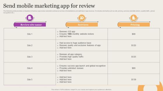 The following slide provides comparison of various app review website to enhance number of installations and optimize in app revenue. It includes elements such as site, pricing, services website visitors, quality traffic, global recognition etc. Want to ace your presentation in front of a live audience Our Leveraging Mobile Marketing Strategies Send Mobile Marketing App For Review Themes Pdf can help you do that by engaging all the users towards you. Slidegeeks experts have put their efforts and expertise into creating these impeccable powerpoint presentations so that you can communicate your ideas clearly. Moreover, all the templates are customizable, and easy-to-edit and downloadable. Use these for both personal and commercial use. The following slide provides comparison of various app review website to enhance number of installations and optimize in app revenue. It includes elements such as site, pricing, services website visitors, quality traffic, global recognition etc.