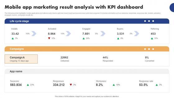 The following slide highlights mobile application promotions outcomes to optimize brand reach and assess new customers acquired. It includes elements such as sessions, responses, response rate, installs, activated, engaged, buyers, campaign results etc. Coming up with a presentation necessitates that the majority of the effort goes into the content and the message you intend to convey. The visuals of a PowerPoint presentation can only be effective if it supplements and supports the story that is being told. Keeping this in mind our experts created Mobile Ad Campaign Launch Strategy Mobile App Marketing Result Analysis With KPI Slides Pdf to reduce the time that goes into designing the presentation. This way, you can concentrate on the message while our designers take care of providing you with the right template for the situation. The following slide highlights mobile application promotions outcomes to optimize brand reach and assess new customers acquired. It includes elements such as sessions, responses, response rate, installs, activated, engaged, buyers, campaign results etc.