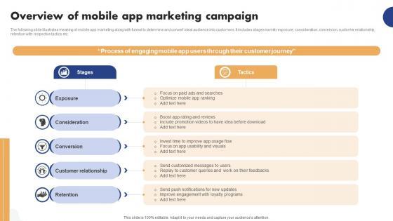 The following slide illustrates meaning of mobile app marketing along with funnel to determine and convert ideal audience into customers. It includes stages namely exposure, consideration, conversion, customer relationship, retention with respective tactics etc. The Mobile Ad Campaign Launch Strategy Overview Of Mobile App Marketing Campaign Graphics Pdf is a compilation of the most recent design trends as a series of slides. It is suitable for any subject or industry presentation, containing attractive visuals and photo spots for businesses to clearly express their messages. This template contains a variety of slides for the user to input data, such as structures to contrast two elements, bullet points, and slides for written information. Slidegeeks is prepared to create an impression. The following slide illustrates meaning of mobile app marketing along with funnel to determine and convert ideal audience into customers. It includes stages namely exposure, consideration, conversion, customer relationship, retention with respective tactics etc.