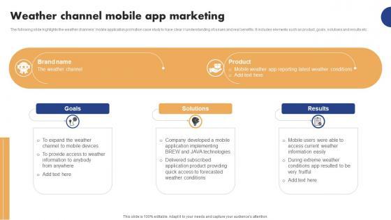 The following slide highlights the weather channels mobile application promotion case study to have clear i understanding of issues and real benefits. It includes elements such as product, goals, solutions and results etc. Are you searching for a Mobile Promotion Strategic Guide For Micro Businesses Weather Channel Mobile App Marketing Topics PDF that is uncluttered, straightforward, and original Its easy to edit, and you can change the colors to suit your personal or business branding. For a presentation that expresses how much effort you have put in, this template is ideal With all of its features, including tables, diagrams, statistics, and lists, its perfect for a business plan presentation. Make your ideas more appealing with these professional slides. Download Mobile Promotion Strategic Guide For Micro Businesses Weather Channel Mobile App Marketing Topics PDF from Slidegeeks today.
