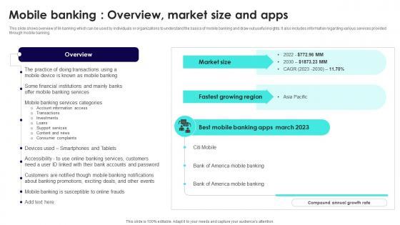 This slide shows overview of M-banking which can be used by individuals or organizations to understand the basics of mobile banking and draw out useful insights. It also includes information regarding various services provided through mobile banking. Create an editable Wireless Banking To Mobile Banking Overview Market Size And Apps Fin SS V that communicates your idea and engages your audience. Whether you are presenting a business or an educational presentation, pre-designed presentation templates help save time. Wireless Banking To Mobile Banking Overview Market Size And Apps Fin SS V is highly customizable and very easy to edit, covering many different styles from creative to business presentations. Slidegeeks has creative team members who have crafted amazing templates. So, go and get them without any delay. This slide shows overview of M-banking which can be used by individuals or organizations to understand the basics of mobile banking and draw out useful insights. It also includes information regarding various services provided through mobile banking.