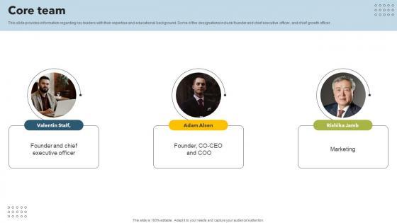 This slide provides information regarding key leaders with their expertise and educational background. Some of the designations include founder and chief executive officer, and chief growth officer. Do you have to make sure that everyone on your team knows about any specific topic I yes, then you should give Core Team Mobile Banking App Investor Funding Elevator Pitch Deck a try. Our experts have put a lot of knowledge and effort into creating this impeccable Core Team Mobile Banking App Investor Funding Elevator Pitch Deck You can use this template for your upcoming presentations, as the slides are perfect to represent even the tiniest detail. You can download these templates from the Slidegeeks website and these are easy to edit. So grab these today This slide provides information regarding key leaders with their expertise and educational background. Some of the designations include founder and chief executive officer, and chief growth officer.