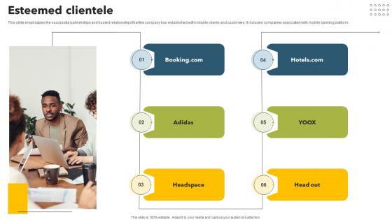 This slide emphasizes the successful partnerships and trusted relationships that the company has established with notable clients and customers. It includes companies associated with mobile banking platform. Get a simple yet stunning designed Esteemed Clientele Mobile Banking App Investor Funding Elevator Pitch Deck It is the best one to establish the tone in your meetings. It is an excellent way to make your presentations highly effective. So, download this PPT today from Slidegeeks and see the positive impacts. Our easy to edit Esteemed Clientele Mobile Banking App Investor Funding Elevator Pitch Deck can be your go to option for all upcoming conferences and meetings. So, what are you waiting for Grab this template today. This slide emphasizes the successful partnerships and trusted relationships that the company has established with notable clients and customers. It includes companies associated with mobile banking platform.